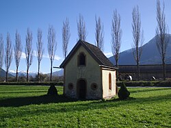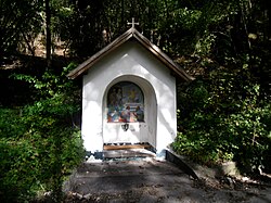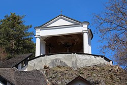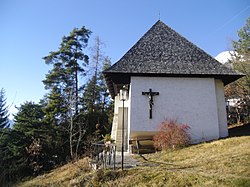 Der halbrunde, offener Bau mit Dreieckgiebel wurde um 1830 errichtet. Er beherbergt eine plastische Kreuzigungsgruppe mit gemalten Bretterfiguren. Die Wandmalerei im Hintergrund mit einer Darstellung von Jerusalem und Gottvater ist der Art des Leopold Puellacher. An der Rückseite der Kapelle befinden sich drei weitere Stationstafeln und eine Auferstehungstafel als Kupfertreibarbeiten von Alfons Neuner (1989).[53][54] | BDA-Hist.: Q37762346 Status: § 2a Stand der BDA-Liste: 2024-06-15 Name: Kalvarienbergkapelle GstNr.: 4440/1 |