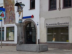 Der Brunnen besteht aus einer um 1977 errichteten Brunnenschale und einer steinernen Brunnensäule mit der polychromen Schnitzfigur des hl. Florian aus dem 19. Jahrhundert.[51] | BDA-Hist.: Q37762439 Status: § 2a Stand der BDA-Liste: 2024-06-15 Name: Brunnen mit hl. Florian GstNr.: 4709/4 |