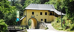 Der mittelalterlicher Rundbogen, durch den die Straße führt, fungierte zeitweise als Zollstation für Burg Stixenstein. Das aufgebaute eingeschoßige Wohngebäude stammt aus dem 19. Jahrhundert | BDA-Hist.: Q37961416 Status: § 2a Stand der BDA-Liste: 2024-06-15 Name: Ehem. Talsperre unterhalb Burg Stixenstein GstNr.: .4 Burg Stixenstein - Talsperre |