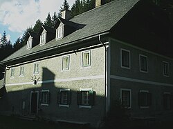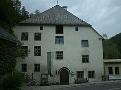 Als Altes Haus wird das alte Herrenhaus des oberen Werkes bezeichnet, es liegt an der oberen Brücke. Der mächtige, breitgelagerte dreigeschoßige Bau hat ein Schopfwalmdach und ist im Kern (Torgewände und Gewände im Erdgeschoß) spätgotisch.[4] Es befand sich ursprünglich im Besitz der Gewerkenfamilie Pögl, später der Familien Pleyberger und Fürst und gelangte 1805 ins Eigentum des Hammerherren Vinzenz Pengg, dessen Nachkommen, die Familie (v.) Pengg-Auheim, das Alte Haus noch heute besitzen.[5] | BDA-Hist.: Q38021249 Status: Bescheid Stand der BDA-Liste: 2024-06-15 Name: Gewerkenhaus, sog. Altes Haus GstNr.: .7 |