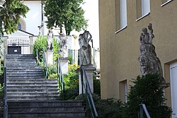 Steile Kirchenstiege mit fünf mehrfigurigen barocken Skulpturen, 1974 erneuert. | BDA-Hist.: Q37902376 Status: § 2a Stand der BDA-Liste: 2024-06-15 Name: Kirchenstiege GstNr.: 1332/5 Kirchenstiege (Tulbing) |
