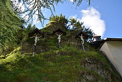 Die Kreuzgruppe vor der Kapelle Allerheiligen besteht aus erneuerten Kreuzen mit Brettschindeldeckung, die Figuren von Jesus und den beiden Schächern tragen. Sie stammen vermutlich aus dem Ende des 18. Jahrhunderts. | BDA-Hist.: Q64031914 Status: § 2a Stand der BDA-Liste: 2024-06-15 Name: Kreuzgruppe GstNr.: 2571 Kreuzgruppe Allerheiligenkapelle |