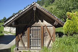 Das Wegkreuz im Bretterkasten aus der zweiten Hälfte des 18. Jahrhunderts ist in typischer Rokokomanier gestaltet und weist einen Corpus im Dreinageltypus mit dreiteiligem Strahlenkranz, einzeiligem Titulus und geschlungenem, rechts geknotetem Lendentuch auf.[10] | BDA-Hist.: Q37814466 Status: § 2a Stand der BDA-Liste: 2024-06-15 Name: Wegkreuz GstNr.: 38/2 |