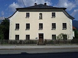 Die zweigeschoßige Heimatstilvilla mit Walmdach wurde 1905/06 als Sommersitz errichtet. Die Fassaden sind durch Eckerker, verschiedene Fensterformen, Putzfaschen, Obergeschoß- und Dachgeschoßsöller gegliedert an der Süd- und Westseite befinden sich geschwungene Hausteinportale, über dem Westeingang ein neugotisches, polychromes Relief der Kreuzigung Christi. Im Inneren haben sich zahlreiche originale Ausstattungsdetails erhalten. Zum Anwesen gehören weiters ein steinernes, rundbogig geschlossenes und abgefastes Gartenportal, ein steinerner Rundturm, ein Marmorbrunnen mit Wappen sowie ein Brecciebildstock mit einer Skulptur des hl. Florian.[14] | BDA-Hist.: Q37771731 Status: Bescheid Stand der BDA-Liste: 2024-06-15 Name: Schaffer-Villa mit Rundturm und Garteneinfriedung GstNr.: 138/3 |