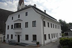 Der dreigeschoßige Bau, der das Gemeindeamt und das Gerätehaus der Freiwilligen Feuerwehr beherbergt, wurde in den 1950er Jahren errichtet. Die Fassade ist durch einen über zwei Geschoße reichenden Erker und einfache gemalte Fensterfaschen gegliedert. Die Reliefdarstellung des hl. Florian wurde 1956 von Emmerich Kerle geschaffen, der Erkerschmuck im selben Jahr von Max Spielmann.[11] | BDA-Hist.: Q37814372 Status: § 2a Stand der BDA-Liste: 2024-06-15 Name: Gemeindeamt GstNr.: .163 |