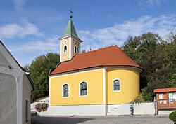 Ein ungegliederter Bau aus der ersten Hälfte des 19. Jahrhunderts mit geschweiftem Giebel, Dachreiter und eingezogener halbrunder Apsis. | BDA-Hist.: Q37902403 Status: § 2a Stand der BDA-Liste: 2024-06-15 Name: Ortskapelle hll. Anna, Sebastian und Josef GstNr.: 598/1 |