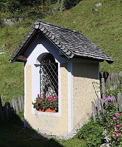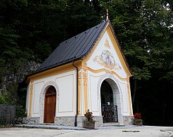 Die Datierung der Johanneskapelle erfolgt mit Unsicherheiten in das 19. Jahrhundert. Die Johanneskapelle ist ein hangseitiger, rechteckiger Nischenbildstock, gedeckt mit Holzschindeln auf einem Satteldach auf Pfetten. Die Gliederung außen erfolgt durch gelb gefärbelte Rauputzfelder und vertiefte, glatte und weiß gefärbelte Faschen. Die südseitige Nischenöffnung endet in einem Karniesbogen und wird durch ein eingesetztes Wabengitter abgeschlossen. Der gewölbte Innenraum ist innen als Grotte gestaltet und komplett mit Steinen ausgekleidet, in der Grotte befindet sich eine Statue von Johannes dem Täufer.[5] | BDA-Hist.: Q37804613 Status: § 2a Stand der BDA-Liste: 2024-06-15 Name: Johanneskapelle GstNr.: .257 Johanneskapelle (Walchsee) |