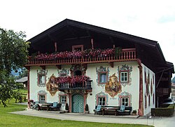 Der vermutlich im 17. Jahrhundert erbaute und im 18. Jahrhundert veränderte Hof erhielt 1765 seinen reichen Freskenschmuck. Die Architekturmalerei und Heiligenmedaillons werden Josef Adam Mölk zugeschrieben. Bei dem Gebäude selbst handelt es sich um einen quergeteilten Einhof mit Mittelflurgrundriss. Der zweigeschoßige, gemauerter Wohnteil hat eine unregelmäßige Achsteilung, der Kniestock ist in Blockbauweise ausgeführt. Das relativ flache, weit ausladende Satteldach liegt auf Pfetten. Vor dem eingangsseitigen Giebel liegt auf unregelmäßig angeordneten Konsolen ein fassadenbreiter Söller. Über dem breiten, flachbogigen Eingangsportal mit gekehltem Gewände befindet sich noch ein kleiner Söller.[4] |
