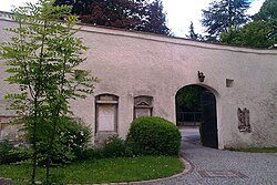 Die Dechantei hinter der Kirche ist ein weitläufiges Gebäude mit Pfeilerarkaden im Hof. Sie stammt aus dem 3. Viertel des 18. Jahrhunderts.[8] | BDA-Hist.: Q38048254 Status: § 2a Stand der BDA-Liste: 2024-06-15 Name: Dechanthof mit ehem. Wirtschaftsgebäuden und Brunnen GstNr.: .160/1, .160/2 Weizbergkirche |
