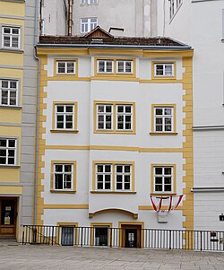 Das Renaissance-Bürgerhaus stammt aus der Zeit vor 1566 und wurde vom kaiserlichen Herold Wilhelm von Pellenstraß errichtet. Vor 1639 erfolgte eine Aufstockung. Bemerkenswert sind vor allem das Erdgeschoß und der dreigeschoßige Keller aus der Bauzeit. Hier befindet sich das einzige in Wien erhaltene Beispiel einer Turmtreppe. | BDA-Hist.: Q37995259 Status: Bescheid Stand der BDA-Liste: 2024-06-15 Name: Sog. Schmales Haus GstNr.: 319 Schmales Haus, Vienna |