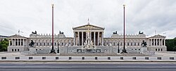 Das Parlamentsgebäude – Theophil Hansens bedeutendstes Werk[3] – wurde 1871–1883 in der Architektur des Strengen Historismus, nämlich in gräzisierendem Stil verbunden mit Formen der Neorenaissance für die beiden Kammern des Parlaments der österreichischen Reichshälfte Österreich-Ungarns erbaut. Der Monumentalbau besteht aus zwei Baublöcken für die halbkreisförmigen Sitzungssäle der beiden Kammern, die einander symmetrisch zugeordnet und durch einen Mitteltrakt als gemeinsamen Eingangsbereich miteinander verbunden sind. An der Außenfassade wurde ein umfangreiches historistisches Skulpturenprogramm umgesetzt. | BDA-Hist.: Q702121 Status: Bescheid Stand der BDA-Liste: 2024-06-15 Name: Parlamentsgebäude GstNr.: 1524/2 Austrian Parliament Building |