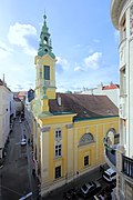 Dieser frühklassizistische Sakralbau wurde 1783/84 von Gottlieb Nigelli anstelle des Wirtschaftshofes des Königinklosters erbaut. Die neobarocke Turmfassade mit toskanischen Pilastern und Segmentgiebel über der Portalachse stammt von Ignaz Sowinski aus dem Jahr 1887. Im Inneren ist die Kirche von straßenseitigen Gängen ummantelt und überkuppelt, er weist seitliche Emporien und im Osten eine Apsis auf. Die Kanzel und der Abendmahltisch sind bedeutende Beispiele frühklassizistischer Ausstattung. | BDA-Hist.: Q875758 Status: § 2a Stand der BDA-Liste: 2024-06-15 Name: Evang.-reformierte Stadtkirche H.B. mit Pfarrhaus GstNr.: 1164, 1165 Reformed City Church, Vienna |