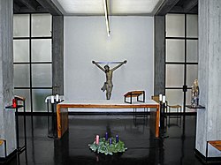 Ottokar Uhl schuf 1956/57 die Studentenkapelle im Edith-Stein-Haus. Der Raum wird durch Betonpfeiler in drei Schiffe geteilt; die Decke des Altarraums sowie die beiden seitlichen Stirnwände sind verglast. Hinter dem Altar befindet sich ein Kruzifix aus dem 18. Jahrhundert. | BDA-Hist.: Q37951696 Status: Bescheid Stand der BDA-Liste: 2024-06-15 Name: Studentenkapelle der Hochschulgemeinde Wien im Edith-Stein-Haus GstNr.: 1541 Edith-Stein-Kapelle, Wien |