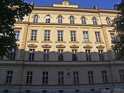 Der an drei Seiten frei stehende strenghistoristische Bau wurde 1868–1870 nach Plänen von Heinrich von Ferstel in Formen der Wiener Neo-Renaissance errichtet. Die Fassade ist mit additiven Giebelfenstern und breiten Eckrisaliten, das Attikageschoß mit Pilastern und Rundbogenfenstern gestaltet. | BDA-Hist.: Q38072949 Status: Bescheid Stand der BDA-Liste: 2024-06-15 Name: Musisch-Pädagogisches Realgymnasium GstNr.: 1335/4 Realgymnasium Fichtegasse 3, Vienna |