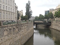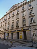 Der ursprüngliche Hauptsitz der Oesterreichischen Nationalbank gilt als „bedeutendes Initialwerk des Wiener Spätklassizismus“[13] und wurde 1819–1824 nach Plänen des Architekten Charles de Moreau in Formen der italienischen Renaissance erbaut. 1874 wurde der Giebel an der Herrengasse abgetragen und durch Ludwig Wächtler ein neues Treppenhaus errichtet, 1872–1875 ein Erweiterungsbau angeschlossen. Die Hauptfassade ist durch eine zweigeschoßige Bogenfolge auf Pilastern gegliedert, der Mittelrisalit durch korinthische Riesenpilaster, Giebelfenster und ein hohes Rechteckportal mit gerader Verdachung auf Konsolen gestaltet. Im Attikageschoß befindet sich an der Stelle des originalen Giebels eine Gruppe von drei Fenstern. Die Seitenfassade ist einfach mit zwei Risaliten ausgeführt. Der Komplex schließt zwei Arkadenhöfe ein. Im Erdgeschoß und im ersten Obergeschoß befinden sich die ehemaligen Prunkräume, deren Dekor allerdings entfernt wurde. Von der Ausstattung der Nationalbank sind im Keller Tresortüren und Schienen mit Drehkreuzen für den Geldtransport, in den Obergeschoßen Stahljalousien erhalten. |