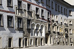 Der frühhistoristische Monumentalbau mit zwei Innenhöfen entstand 1846/47 durch Paul Sprenger. Der blockhafte Baukörper ist durch additive Rundbogenfenster mit Rundgiebeln gestaltet, die Dekorelemente in den Obergeschoßen sind in Terrakottafarbe ausgeführt. Von der Herrengasse und vom Minoritenplatz führen drei- bzw. einachsige Säulenportale unter leicht vorkragenden Balkons in den Komplex; das Portal am Minoritenplatz wird von Statuen der Landeshauptleute Wolfgang Freiherr von Polheim und Wartburg sowie Johann Anton von Pergen in Rundnischen flankiert. – Der Marmorsaal im ersten Obergeschoß des Quertraktes ist mit Deckenfresken von Leopold Kupelwieser (entstanden 1848–1850) dekoriert. Der Regierungssitzungssaal sowie das ehemalige Vorzimmer des Büros des Landeshauptmanns weisen eine späthistoristische Ausstattung auf, die aus 1891/92 datiert. Anmerkung: Identanschrift Minoritenplatz 8 |