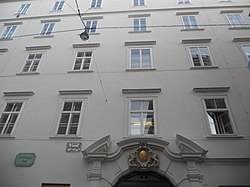 Das Palais, das von 1639 bis 1940 im Besitz der Familie Trauttmansdorff stand, wurde nach 1639 erbaut und 1792 durch Andreas Zach im Stil des Klassizismus verändert. Die schlichte frühbarocke Fassade ist durch Ortsteinquader gestaltet und weist additiv gereihte Fenster mit Rahmungen und geraden Verdachungen aus dem Jahr 1792 auf. Die Mittelachse mit dem geschichteten Pilasterportal mit Segmentbogenöffnung unter verkröpftem Gebälk ist durch einen seichten, von Lisenen eingerahmten und gebänderten Mittelrisalit aus der Mitte des 17. Jahrhunderts betont; oberhalb des Portals befindet sich ein Dreiecksgiebelfenster mit dem fürstlichen Wappen. Das zweite Obergeschoß wurde 1792 aufgestockt. In der Beletage befinden sich bedeutende klassizistische Festräume: der Grüne und der Große Salon mit vorgelagertem Gang (1792) sowie das spätklassizistische Goldkabinett und der Salon in Formen des Spätempire (1841). | BDA-Hist.: Q27941609 Status: Bescheid Stand der BDA-Liste: 2024-06-15 Name: Palais Trauttmansdorff GstNr.: 99 Palais Trauttmansdorff |