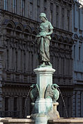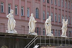 Die vier barocken Steinfiguren stammen von der Attika des ehemaligen Lazansky-Hauses am Stock im Eisen und wurden 1886 an den jetzigen Standort übertragen. | BDA-Hist.: Q60661007 Status: § 2a Stand der BDA-Liste: 2024-06-15 Name: Figuren am Eingang zum Esterhazypark GstNr.: 48/9 Statues at Esterházypark |