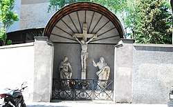 Die in einer Nische aufgestellten Kreuzigungsgruppe besteht aus einem Steinkruzifix aus dem zweiten Viertel des 19. Jahrhunderts sowie Figuren der Heiligen Maria und Johannes vermutlich aus dem 18. Jahrhundert. | BDA-Hist.: Q37806756 Status: § 2a Stand der BDA-Liste: 2024-06-15 Name: Kreuzigungsgruppe GstNr.: 1006 Crucifixion group Brückengasse, Vienna |