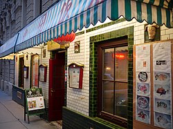 Die Fassade im Bereich der ehemaligen Fleischerei ist mit weißen Wandfliesen verkleidet, Tür- und Fensterumrahmungen sowie der Sockel sind in schwarzen Fliesen ausgeführt. Rechts und links vom Eingang weisen Reliefs eines Widder- und eines Ochsenkopfes auf den seinerzeitigen Geschäftsgegenstand hin. | BDA-Hist.: Q37881145 Status: § 2a Stand der BDA-Liste: 2024-06-15 Name: Ladenfront einer ehem. Fleischerei GstNr.: 97/1 Capistrangasse Fleischerei |