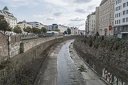 Die Regulierung des Wienflusses erfolgte in den Jahren 1894–1904, wo der größte Teil des Flusses in ein Betonbett gelegt wurde. Projektleiter waren Rudolf Krieghammer und Ludwig Leupschitz sowie Friedrich Ohmann und Josef Hackhofer (baukünstlerische Leitung). Otto Wagners Idee, den Fluss einzuwölben, um eine Prachtstraße zu errichten, wurde nur in einem Teilstück entsprochen. | BDA-Hist.: Q37826641 Status: Bescheid Stand der BDA-Liste: 2024-06-15 Name: Wientalverbauung GstNr.: 272/1, 1620/1, 1620/2, 1653/13, 1586/5, 1586/2, 1653/15 |