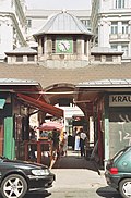 Auf der Einwölbung des Wienflusses zwischen Linker und Rechter Wienzeile wurden ab 1910 nach einem Konzept von Friedrich Jäckel in drei Zeilen über 120 gemauerte Marktstände in einheitlichem Stil erbaut. Die Mittelzeile ist durchgehend blockweise verdacht mit rundbogigen Durchgängen. Die Dächer sind durch Glockendächer und teilweise Laternen rhythmisiert. Das Marktamt, ein an der Ecke Wienzeile – Kettenbrückengasse frei stehender vierseitiger Pavillon mit markantem Glockendach und einem farbigen Majolikarelief (Putto auf einem Bären reitend) im Giebelfeld der Vorderwand von Franz Barwig d. Ä., entstand 1915/16. Die 1817 erbaute Naschmarktkapelle wurde 1916 vom früheren Standort im Freihaus auf der Wieden auf den Naschmarkt (gegenüber Rechte Wienzeile 18) transferiert. | BDA-Hist.: Q417645 Status: § 2a Stand der BDA-Liste: 2024-06-15 Name: Marktanlage Naschmarkt samt Pavillons und sonstigen Gebäuden GstNr.: 1653/15, 1653/1, 1653/14, 1586/5, 1653/13, 272/1, KG Wieden: 1703/4, 1595/9, 1703/72, 1703/73, 1703/75, 1703/56 Naschmarkt, Vienna |