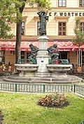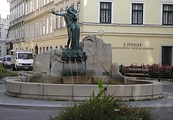 Der Brunnen wurde 1893 von Anton Paul Wagner errichtet. Ein Steinpfeiler mit metallener Mädchenfigur wird von angeketteten Männerfiguren flankiert, die als Wasserspeicher dienen. Darunter befinden sich zwei von Gittern eingefasste steinerne Rundbecken. | BDA-Hist.: Q1342032 Status: § 2a Stand der BDA-Liste: 2024-06-15 Name: Engelbrunnen GstNr.: 1592/1 Engelbrunnen |