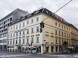 Dieses klassizistische Zinshaus, das die Formen gleichzeitiger Monumentalgebäude übernimmt wurde 1802 von Franz Wipplinger erbaut. Die Hauptfront weist eine korinthische Kolossalpilasterordnung auf, die Fassade insgesamt ist von Bändern mit Masken- und Girlandendekor überzogen. Es hat ein mächtiges Satteldach mit Dachhäuschen und Dachreiter. Im Hof gibt es einen Hausbrunnen mit Zeusmaske. | BDA-Hist.: Q81930052 Status: Bescheid Stand der BDA-Liste: 2024-06-15 Name: Wohn- und Geschäftshaus, Bürgerhaus GstNr.: 549 Favoritenstraße 2 |