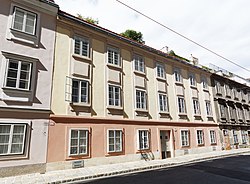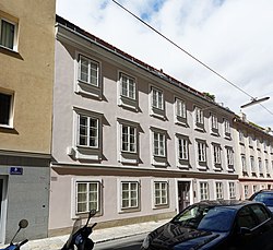 Dieses Biedermeier-Vorstadthaus wurde 1828 von Phillip Brandl erbaut und im 2. Viertel des Jahrhunderts an der Fassade verändert. Es hat einen flach gequaderten Mittelrisaliten und weist reichen Reliefschmuck mit Muschel-, Adlerreliefs und Palmetten auf. | BDA-Hist.: Q37901047 Status: Bescheid Stand der BDA-Liste: 2024-06-15 Name: Bürgerhaus GstNr.: 496 Floragasse 5 |