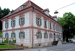 Das Gebäude ist das ehemalige Direktionsgebäude des Bergbaues Kalkgrub der Graz-Köflacher Bahn. Anmerkung: Es liegt im ehemaligen Kohlenbergbaugebiet an der Radlpass Straße B 76 in zwei Katastralgemeinden:[3] Sein Hauptteil befindet sich auf einem Grundstück der EZ 163 KG 61127 Limberg.[4] Seine nordöstliche Fassade gegen die Bundesstraße steht – nach der Darstellung im GIS-Steiermark – auf dem angrenzenden Grundstück Nr. 1109 der EZ 1111 KG 61057 Schwanberg, das in der Übersichtsliste des Bundesdenkmalamtes nicht erwähnt ist und auf dem auch kein Denkmalschutz verzeichnet ist.[5] Diese Auffälligkeit muss nicht auf einen Fehler zurückzuführen sein, sie kann ihre Ursache auch in einer nicht exakt übereinstimmenden Darstellung der händisch gezeichneten Katasterunterlagen und des elektronischen Informationssystems haben. |