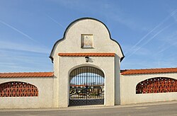 Das gemalte Wandbild über dem Friedhofseingang stammt aus dem Jahr 1995. 2016 erfolgte ein Friedhofsumbau. | BDA-Hist.: Q37849765 Status: § 2a Stand der BDA-Liste: 2024-06-15 Name: Friedhof christlich GstNr.: 17, 18/2 |
