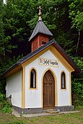Die Kapelle an der 1904 errichteten Erzherzog-Eugen-Waldpromenade wurde 1908 anlässlich des 60-jährigen Regierungsjubiläums Kaiser Franz Josefs vom Verschönerungsverein Zellbergeben erbaut. Ursprünglich Kaiserjubiläumskapelle oder Eugenkapelle, wird sie seit 1938 als Josefskapelle bezeichnet. 1987 wurde sie nach einem Schwelbrand renoviert. Der einjochige Mauerbau mit dreiseitigem Chorschluss und Dachreiter am schindelgedeckten Satteldach ist giebelseitig von Südosten über ein spitzbogig geschlossenes Portal mit Türblatt in Reliefschnitzerei erschlossen. Die rahmende Putzgliederung der Fassaden an Mauerkanten, Wandöffnungen und in der Hohlkehle unter dem Dachansatz ist farblich akzentuiert. Das Innere weist ein flaches Tonnengewölbe auf, der Altarraum ist durch ein Schmiedeeisengitter vom Betraum getrennt.[3] | BDA-Hist.: Q37745734 Status: § 2a Stand der BDA-Liste: 2024-06-15 Name: Kapelle hl. Josef GstNr.: .574 St-Josef-Kapelle (Zellberg) |
