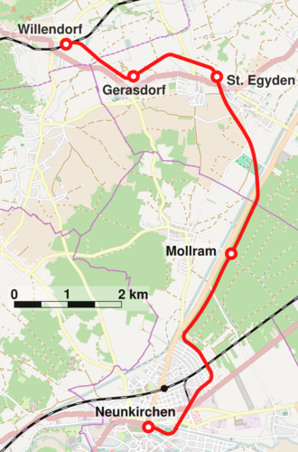 Vom Ausgangspunkt Willendorf zweigte die Strecke in einer Rechtskurve in südöstlicher Richtung von der Schneebergbahn ab, führte auf Gerasdorf zu und erreichte nach einer engen Linkskurve die Haltestelle des Ortes. Zunächst in südöstlicher Richtung wurde der Höhenzug zwischen Gerasdorf und Mollram in einem weiten Rechtsbogen umfahren. Nach der Haltestelle St. Egyden führte die Bahn nach Süden zwischen den Dörfern St. Egyden und Urschendorf vorbei an Neusiedl am Steinfelde zur Blätterstraße, die niveaugleich gekreuzt wurde. Die nächsten Kilometer verliefen parallel zur Ersten Wiener Hochquellenwasserleitung und der Blätterstraße (heute L 137), an der auch die Haltestelle Mollram lag. Kurz vor Neunkirchen schwenkte die Trasse von der Blätterstraße weg am Waldrand entlang und querte die Südbahn. Die Bahn wurde nicht in den Staatsbahnhof eingeführt, sondern über Lerchenfeld und Wienerstraße zur Schwarza gebaut. Nach der Querung des Flusses und einer 90°-Rechtskurve wurde der Lokalbahnhof (