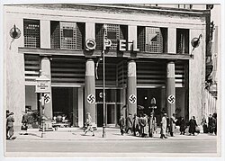Bis zu ihrem Konkurs 1925/26 wurde das Gebäude von der Firma Goldman & Salatsch unverändert weiter genutzt.[6] Die Nutzungsänderungen in den 1930er/40er Jahren infolge der Besitzerwechsel – etwa 1934 durch die „Universale Hoch- und Tiefbau AG“ und 1938 von „Opel & Beyschlag“[7] – führten zur sukzessiven Zerstörung der Einrichtung des Parterres und des Mezzanins.[8] Zur Nutzung des Gebäudes während der NS-Zeit schreiben Czech und Mistelbauer: „Die Vorhalle zum Michaelerplatz wurde vor der Volksabstimmung 1938 kurzfristig zu einem ‚Altar unserer Zeit‘ dekoriert, an dem vor einer Hitler-Büste zwei SS-Posten standen. Statt der Beleuchtungskörper hingen Hakenkreuze von den Messingkandelabern, die eigentlich ‚repräsentative‘ Architekturteile wurden dagegen verdeckt.“[9] Vor die Firmen-Wappen wurden Hakenkreuze montiert.[10]