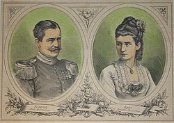 | Prinz Friedrich von Hohenzollern-Sigmaringen und Prinzessin Luise von Thurn und Taxis (1859–1948), kolorierter Holzstich, ca. 16 x 23 cm | zvab | Autor/-in unbekannt Unknown author | Datei:Prinz Friedrich und Prinzessin Luise, 1878.jpg |