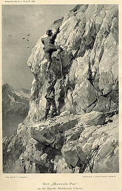 | Summit Post Source: 1 Image: 2 Article (p2 & 68): 3 | Edward Theodore Compton | Datei:Compton, 1895, Der Mauvais Pas an der Aiguille Méridionale d’Arves.jpg | ||