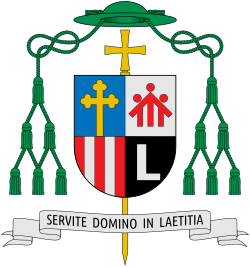 | Das Wappen von Bischof Ludwig Schwarz Das viergeteilte Schild zeigt links oben in Blau ein goldenes, aus der Teilungslinie wachsendes Kleeblattkreuz (Teil des Bistumswappens der Diözese Linz),rechts oben in Rot das Logo der Salesianer Don Boscos, Provinz Österreich, aus der Bischof Ludwig hervorgegangen ist,links unten in Rot zwei silberne Pfähle (Teil des Diözesanwappens und Landesfarben Oberösterreichs), rechts unten auf schwarzem Grund (Hinweis auf den Familiennamen Schwarz) den weißen Unzialbuchstaben L (für Linz und Ludwig). Darunter befindet sich der Wappenspruch „SERVITE DOMINO IN LAETITIA“ (Dienet dem Herrn in Freude! Psalm 100,2a). Umrahmt wird das Wappen mit dem grünen Bischofshut und zwölf Quasten (12 Apostel, deren Nachfolger die Bischöfe sind). www.dioezese-linz.at | Eigenes Werk | SajoR | Datei:Coat of arms of Ludwig Schwarz.svg | |