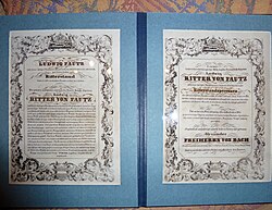 | Ernennungsurkunde von Admiral Ludwig von Fautz zum Ritter von 27.12.1854 | Scan der Originalurkunde im Besitz Georg Bregant (Nachfahre von VA Fautz) | Fam. Bregant | Datei:Fautz-Ritterernennung.jpg |