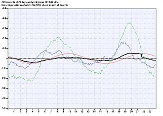 Der Luftdruck ist einer täglich wiederkehrenden Periodik unterworfen, die zwei Maximal- und zwei Minimalwerte pro Tag aufweist. Er wird durch die täglichen Schwankungen der Lufttemperatur angeregt, wodurch sich ein stärkerer 12-Stunden-Rhythmus (als semicircadian bezeichnet) und ein schwächerer 24-Stunden-Rhythmus (circadian) zeigen. Die Maxima finden sich gegen 10 und 22 Uhr, die Minima gegen 4 und 16 Uhr (Ortszeit).[1][2][3] Die Amplituden sind breitengradabhängig. In Äquatornähe liegen die Schwankungen bei Werten bis zu 5 hPa. In den mittleren Breiten liegen die Schwankungen, aufgrund der größeren Corioliskraft (als Rückstellkraft der Schwingung), bei etwa 0,5 bis 1 hPa. Die Kenntnis des örtlichen Tagesganges des Luftdrucks erhöht die Aussagekraft eines Barogramms zur Einschätzung des Wettergeschehens, insbesondere in tropischen Gebieten. Direkt zu beobachten ist der Tagesgang in der Regel jedoch nicht, da er von dynamischen Luftdruckschwankungen überlagert wird. Nur bei hinreichend genauer Messapparatur und stabilen Hochdruckwetterlagen ist es möglich, diese Schwankungen ungestört zu beobachten.