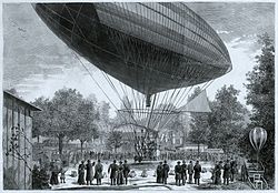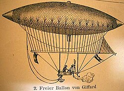 Das erste wirkliche Luftschiff, die „GiffardI“, führte seine Jungfernfahrt am 24. September 1852, rund 50Jahre vor dem ersten Motorflug eines Flächenflugzeugs, durch. Es war von Henri Giffard gebaut worden und wurde durch eine 2,2kW (3PS) starke Dampfmaschine, die nur 45kg wog, angetrieben. Die Fahrt führte von Paris nach Trappes über eine Strecke von 27km. Die Geschwindigkeit betrug etwa 9km/h und die Flughöhe bis zu 1800m. Der Langballon, in den Giffard seine Dampfmaschine eingebaut hatte, war 44m lang und hatte ein Volumen von 2.500m³. Gondel und Motor hingen an einem Balken unter dem Ballon. Gesteuert wurde mit einem dreieckigen Segel. 1855 wollte Giffard ein zweites Luftschiff testen, wobei dieses jedoch zerstört wurde.[5] Im amerikanischen Bürgerkrieg versuchte der Arzt und Erfinder Solomon Andrews die Unionsregierung für seine Luftschiffe AereonI&II zu gewinnen. Trotz erfolgreicher Testfahrten blieb das staatliche Interesse aber gering und auch private Geldgeber zogen sich nach dem Krieg zurück.[6]
