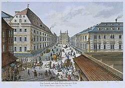 | Das Lugeck mit dem Regensburger Hof. Urheber: Johann Wenzel Zinke (1797-1858) nach Salomon Kleiner (1700-1761). Farbradierung, 23,6 cm x 34 cm (Pl.), 27 cm x 36,2 cm (Bl.) Beschreibung übernommen vom Historischen Museum der Stadt Wien (Inv. Nr. 70.297). 1 | http://www.museum.vienna.at/dynamicPage.asp?MenuID=1907 | Johann Wenzel Zinke (1797-1858) nach Salomon Kleiner (1700-1761) | Datei:Lugeck Vienna (19 century).jpg | |
