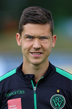 | Fußballmeisterschaftsspiel Erste Liga 2017-18 - SC Wiener Neustadt (weiße Trikots) vs. FC Wacker Innsbruck (schwarz-grüne Trikots) 1:0. – Das Bild zeigt den Torwart des FC Wacker Innsbruck Lukas Wedl. | Eigenes Werk | Steindy ( Diskussion ) 09:43, 29 May 2018 (UTC) | Datei:SC Wiener Neustadt vs. FC Wacker Innsbruck 2018-05-21 (054).jpg | |
