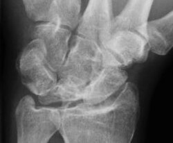 | Dorsopalmare Röntgenaufnahme vom linken Handgelenk eines 58-jährigen Druckluftarbeiters: Lunatummalazie | Überlassene CD beim Patienten | Dr. med. Ulf Schneider, Orthopäde in Anklam | Datei:Lunatummalazie AP.jpg | |