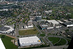 | Rheintal/Walgau Autobahn, A14 . Verkehrsknoten Dornbirn Süd. Bild-Front: Mega bauMax , Mitte: Panoramahaus Mitte Links: Kika (Möbelhaus) , Links: Metro , Rechts: Messepark und ein Teile des Dornbirner Messegeländes , Front-Rechts ÖAMTC . Aufgenommen während eines Fluges mit einer Propellermaschine des Types: D-EJCR Robin DR400-180R . Zur Beachtung die verschiedenen Kreisverkehrsarten . | Eigenes Werk | -- Böhringer | Datei:DornbirnSüdVLBG.jpg |