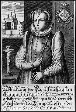 | Porträt von Elisabeth von Österreich , im Hintergrund ist das von ihr gestiftete Wiener Königinkloster zu sehen | Jubiläumsbroschüre der Lutherischen Stadtkirche | unbekannt | Datei:Elisabeth Königinnenkloster Wien.JPG |