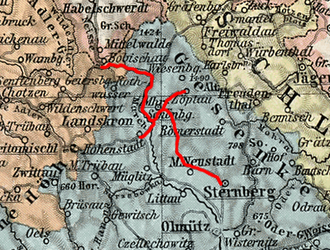 Am 11. September 1871 wurde der Firma Gebrüder Klein, den Herren Eduard Oberleithner, Karl Oberleithner, Alois Schulz, Ignaz Seidl, Carl Siegl sen., Franz Leischner und der Firma Hielle & Diettrich „das Recht zum Bau und Betrieb einer Locomotiveisenbahn von Sternberg im Anschlusse von der mährisch-schlesischen Nordbahn über Mährisch-Neustadt, Mährisch Schönberg, Hannsdorf und Grulich an einen Punct der Eisenbahnlinie Wildenschwert–Mittelwalde nächst der österreichisch-preußischen Gränze“ erteilt.[1]