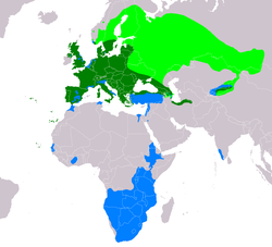 | Distribution map of eurasian buzzard (Buteo buteo) according to IUCN verzion 2019.2. Key: Extant, breeding Extant, resident Extant, non-breeding | Made with Natural Earth. Free vetor and raster map data @ naturalearthdata.com. Range map from BirdLife International 2017. Buteo buteo (amended version of 2016 assessment). The IUCN Red List of Threatened Species 2017: e.T61695117A119279994. https://dx.doi.org/10.2305/IUCN.UK.2017-3.RLTS.T61695117A119279994.en . Downloaded on 07 October 2019 as visual indicator of distribution. | SanoAK : Alexander Kürthy | Datei:ButeoButeoIUCN2019 1.png | |