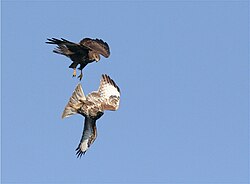 Fremde Mäusebussarde werden durch schnellen Anflug mit kräftigen Flügelschlägen aus dem Luftraum über dem Brutrevier vertrieben. Während der Brut und Jungenaufzucht werden diese Grenzstreitigkeiten zwischen Nachbarpaaren seltener. Mit einzelnen fremden Mäusebussarden kann es gelegentlich noch zu Auseinandersetzungen kommen.[40]