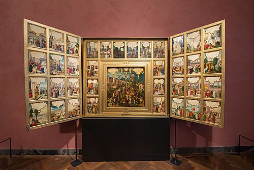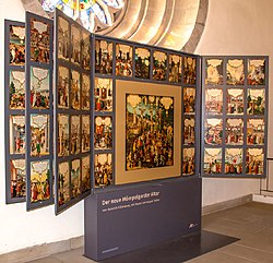 Der aus Fichtenholz gefertigte Altar besteht aus einem Mittelschrein und drei beiderseits bemalten Flügelpaaren. Das Mittelbild im Schrein ist 98 × 91 cm groß und von 12 kleineren Bildern an drei Seiten umrandet. Die einzelnen Flügel haben die Maße von 185 × 101 cm und beinhalten pro Seite 12 Bilder, die in 4 Reihen mit 3 Bildern angeordnet sind. Die insgesamt 156 kleinen Bilder sind jeweils 41 × 28 cm groß.[1]