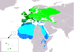 Die Überwinterungsgebiete sind von der Zugdistanz abhängig und reichen von der Küste des Atlantiks in West- und Südeuropa bis nach Südafrika. Eine wachsende Anzahl von Individuen überwintert bereits in Mitteleuropa.[2]